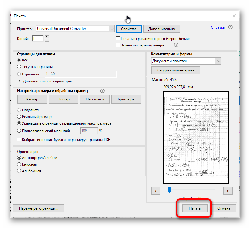 Следующим шагом надо выбрать виртуальный принтер, который будет использоваться для печати, так как нам не надо непосредственно распечатать сам файл, надо лишь получить его в другом формате. Виртуальный принтер должен называться «Universal Document Converter».