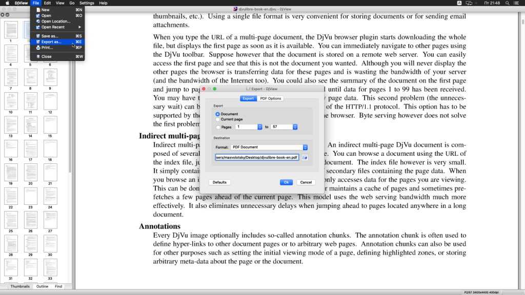 Программа DjView позволяет легко конвертировать DjVu в PDF на компьютерах Apple. Подключение к интернету для этого не требуется.