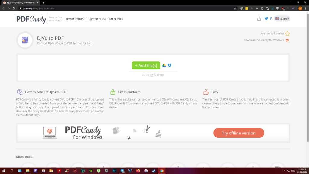 Информация о каких‑либо ограничениях по размеру файлов или количеству конвертаций на сайте PDFCandy отсутствует. Отметим, что у сервиса есть платная версия для Windows, но она предназначена для других форматов и не работает с DjVu.