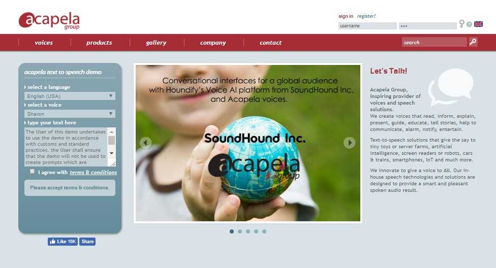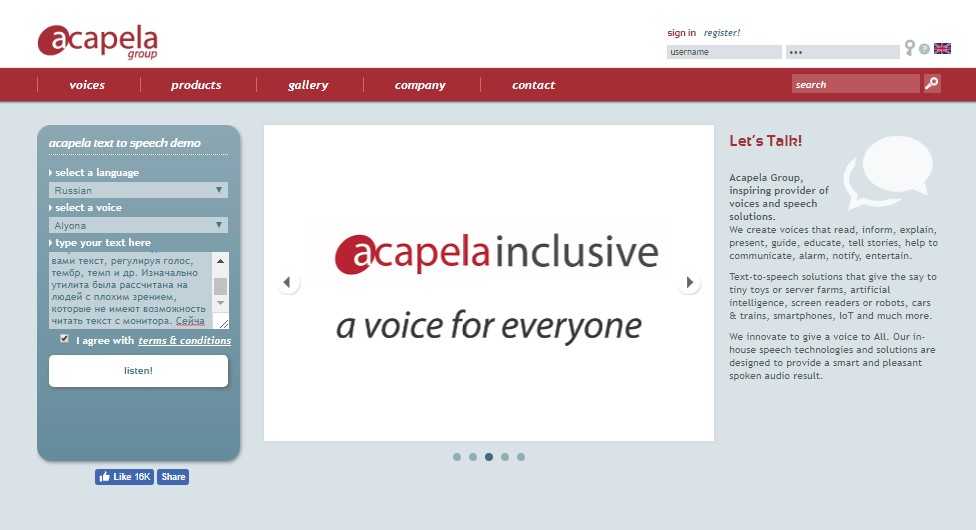 Acapela – это иностранный сервис, способный озвучить текст на 35 языках и диалектах. Примечательно, что портал озвучивает иностранные слова с характерным акцентом (например, русские слова читает англичанин). На сайте представлена демонстрационная версия продукта с ограниченным размером до 300 символов. Еще одним минусом послужит требования каждый раз соглашаться с условиями сайта. Для русской локализации предлагается один вариант озвучки текста – голосовой движок Alyona.