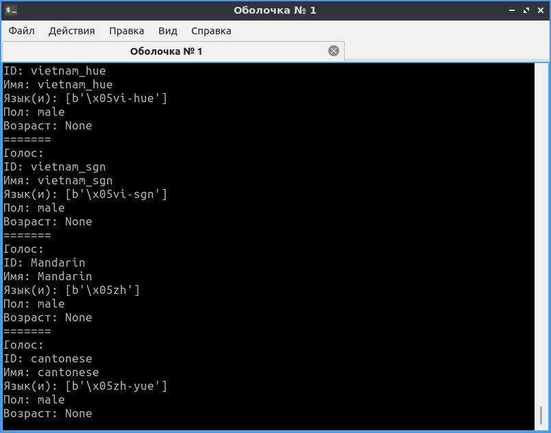 Теперь открываем терминал или командную строку, переходим в директорию, куда сохранили скрипт, и запускаем list_voices.py.