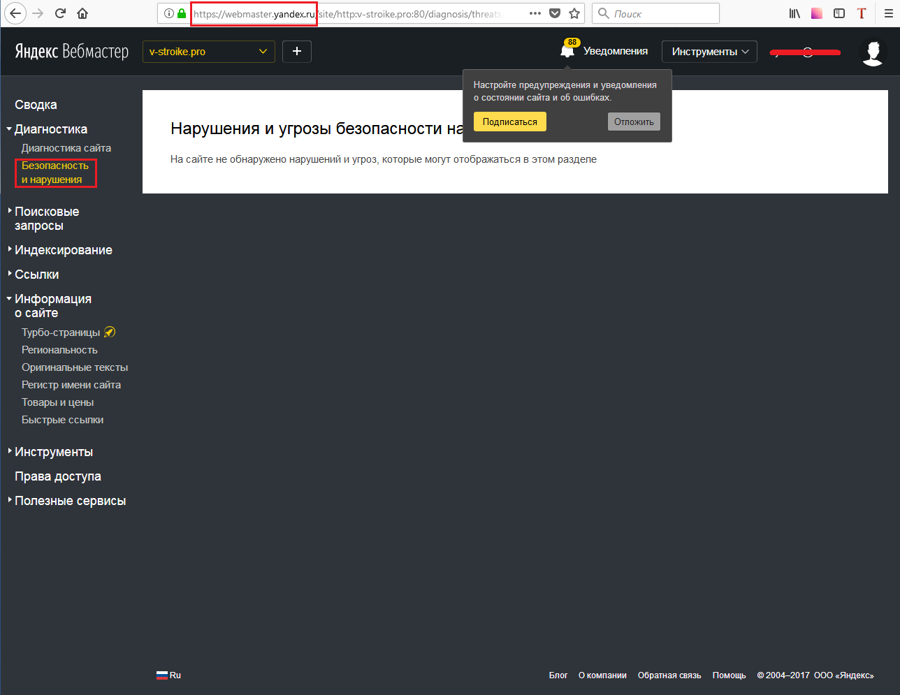 Яндекс.Вебмастер отображает информацию о них на странице «Диагностика» — «Безопасность и нарушения».