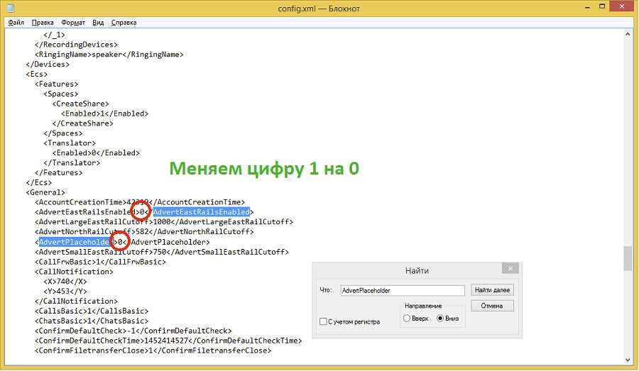 Разметка файла сходна с HTML. Между открывающим и закрывающим тегом в обоих случаях вам нужно поставить ноль. Эта опция отключает сам показ рекламных секторов в Скайпе. Если вы сделаете этот шаг, но обойдётесь без предыдущего, Skype не будет показывать вам рекламу, но всё равно будет её загружать.