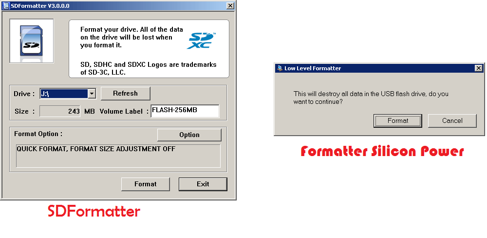 В Formatter Silicon Power вообще есть только одно маленькое окно с двумя кнопками (там нужно нажать Format), а в SDFormatter есть больше опций, но всё равно достаточно будет нажать на кнопку Format.