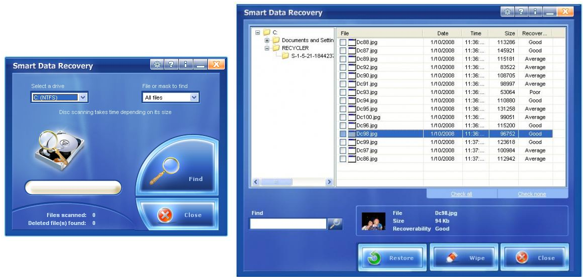 Smart Data Recovery – нужно выбрать носитель и нажать кнопку Find, после чего произойдёт поиск всех файлов, которые хоть как-то можно восстановить;