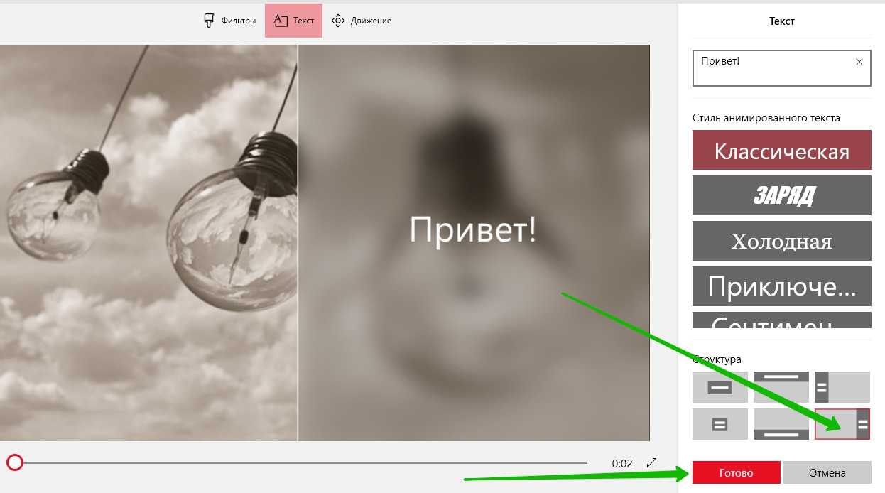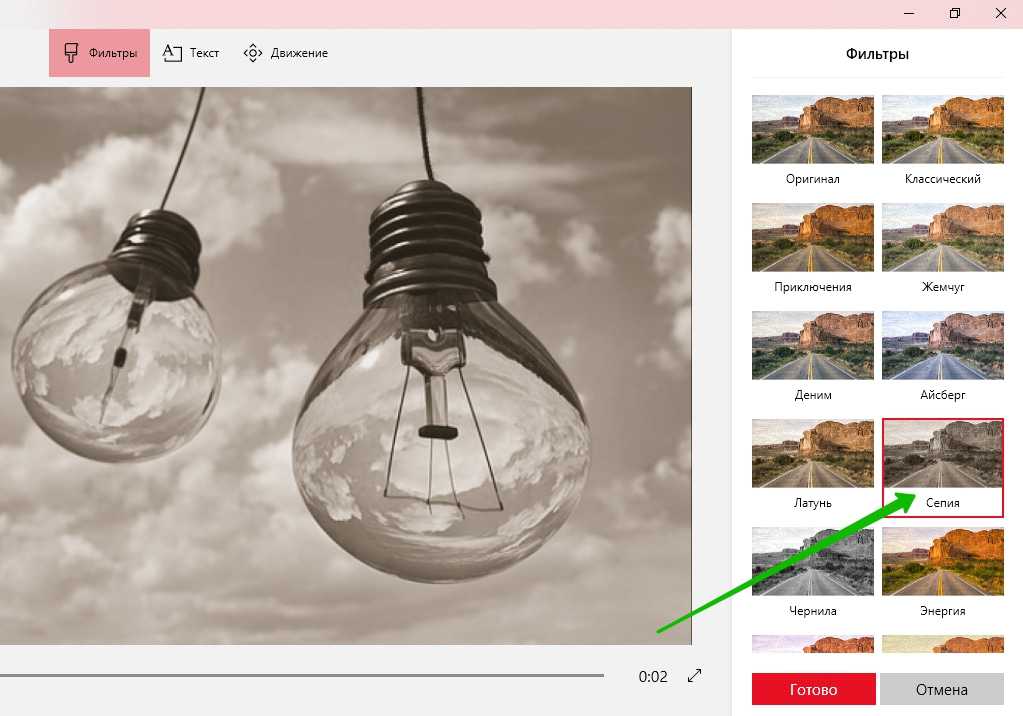 Вы можете выбрать фильтры для каждого изображения в видео. После выбора фильтра (справа), нажмите на кнопку Готово (внизу).