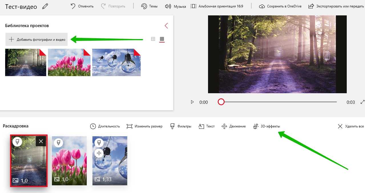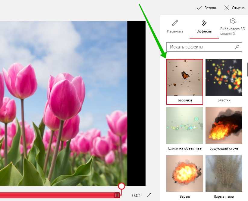 Можно выбрать 3d эффект и наложить его на видео. Справа выберите любой вариант и посмотрите видео. Пример, на вашем видео могут летать бабочки, снежинки, шарики, фейерверк, огни, звёзды, литься вода и т.д.