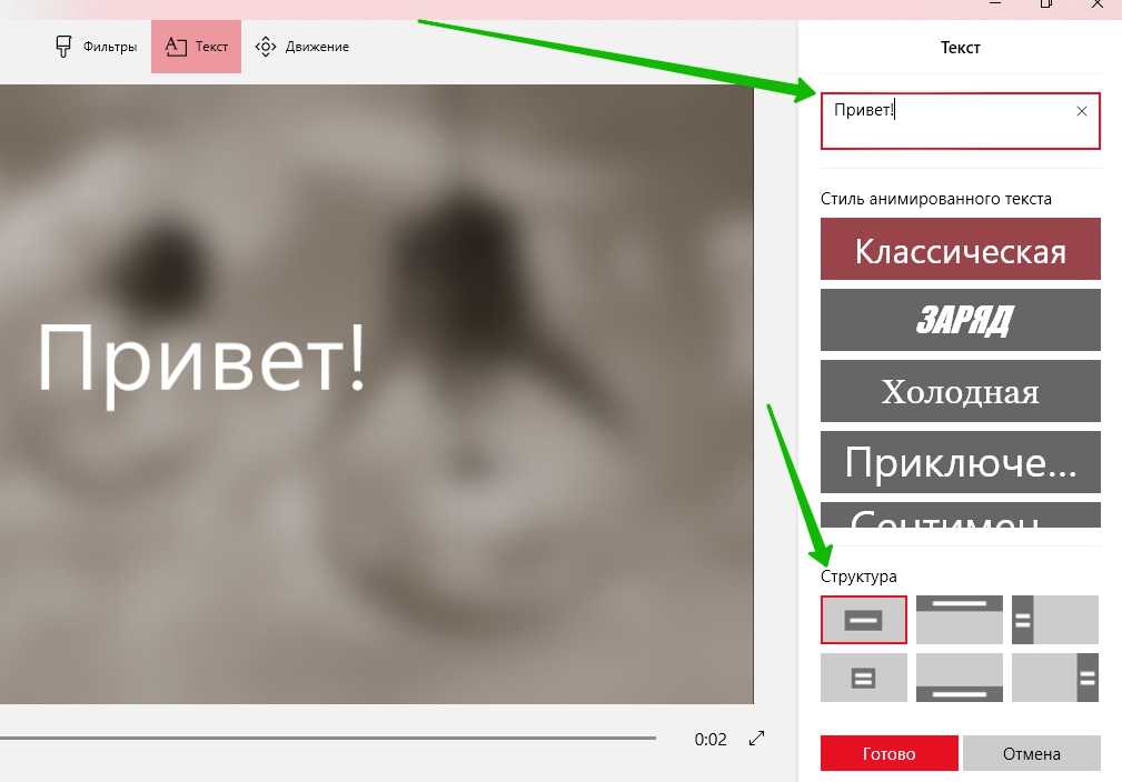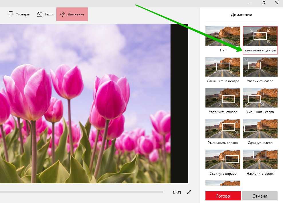 Можно выбрать направление движения или смещения видео. Нажмите на вариант справа и посмотрите, как изображение сдвинется в указанную сторону.