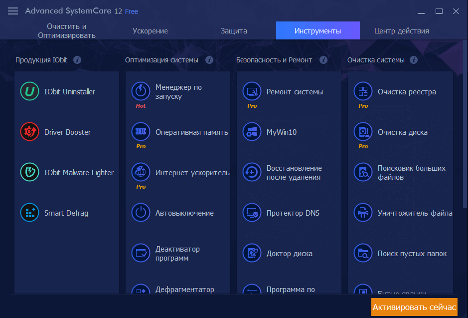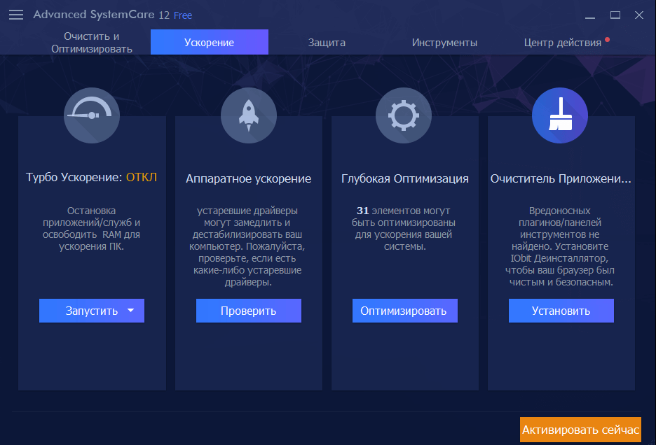 В Advanced SystemCare есть все, что может понадобиться для поддержания ПК в отличной форме: деинсталляторы, программы обновления драйверов и т. д. Набор функций приложения нацелен на ускорение работы компьютера и очищение жесткого диска от мусора. Чтобы система всегда работала корректно, запуск программы следует выполнять раз в неделю.