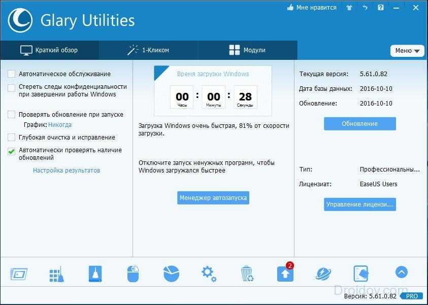 Для совсем «зеленых» пользователей в Glary Utilities Free предусмотрена чистка компьютера в один клик. Программа проведет детальный анализ системы, после чего выдаст подробный отчет о проделанной работе. Утилита укажет какие файлы можно удалить и сколько памяти это прибавит. Работает Glary Utilities Free довольно шустро. Полная чистка ноутбука от ненужных программ займет не более 10 минут. Разработчик довольно часто выпускает обновления для Glary Utilities Free, что порой раздражает.