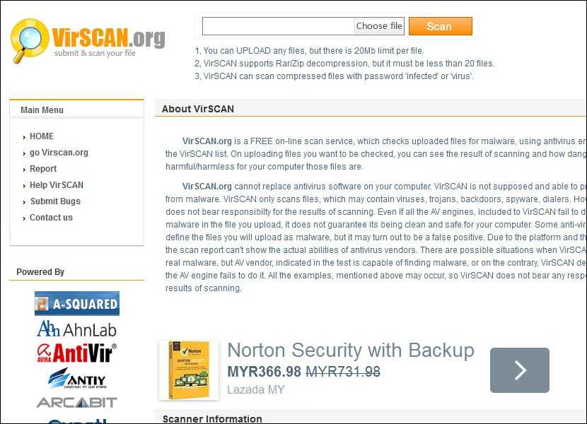 VirSCAN — бесплатный китайский сервис для проверки на вирусы онлайн. VirSCAN.org поддерживает работу технологии 39 антивирусных сканеров.