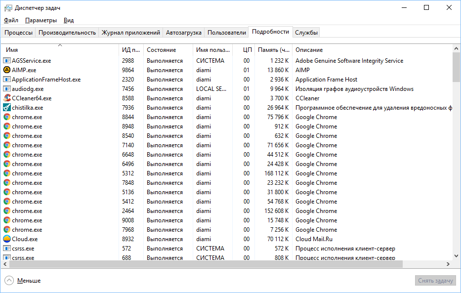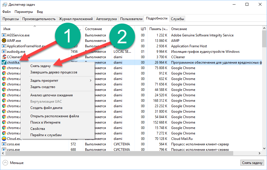 - Когда диспетчер задач будет запущен, перейдите на вкладку Подробности и внимательно изучите список запущенных процессов. Если найдете посторонний, останавливайте его и уже потом удаляйте файлы.