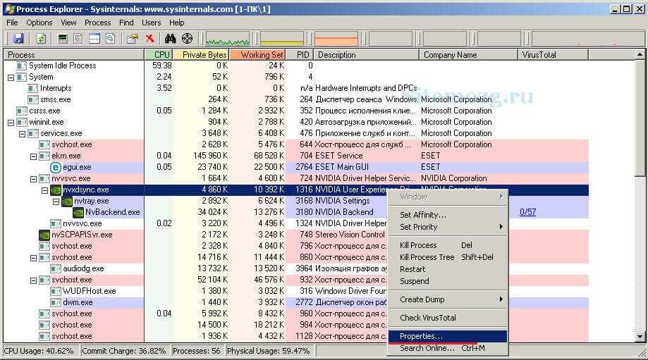 Как только вы нашли процесс отвечающий за показ рекламы — попробуйте остановить его и проверьте (перезагрузив компьютер) пропала ли реклама. Если он снова появился — найдите местоположение файлов, которые его запускают и удалите их. Для этого выберите «Properties» в контекстном меню.