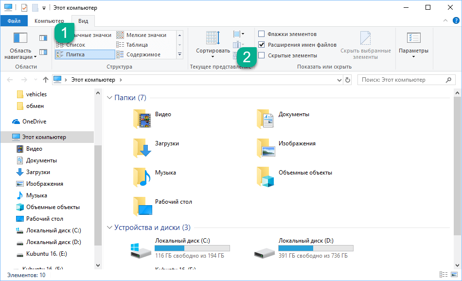 - Когда компьютер перезагрузится в безопасном режиме, откройте проводник Виндовс и активировав вкладку Вид, включите показ скрытых файлов и папок.