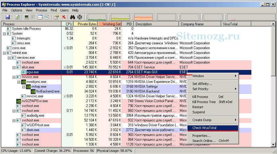 Если вы сомневаетесь в каком-либо процессе, то его можно проверить на вирусы. Для этого выберите его и откройте контекстное меню. В нём выберите «Check VirusTotal» как на изображении ниже. Результаты будут показаны в колонке справа. Так же можно просто поискать информацию о нём в любой поисковой системе.