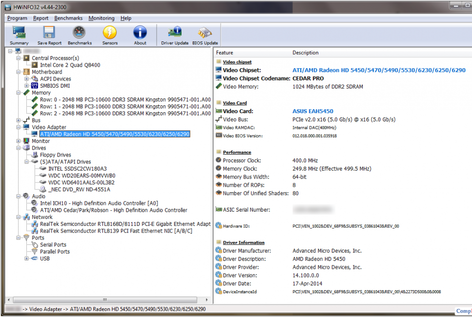 - graphics card. Представлена информация о модели, серии, идентификационном коде, драйвере, его версии, битности;