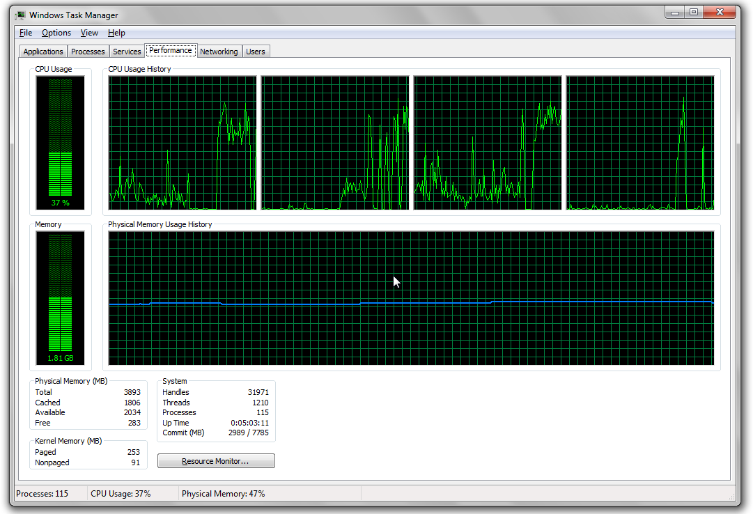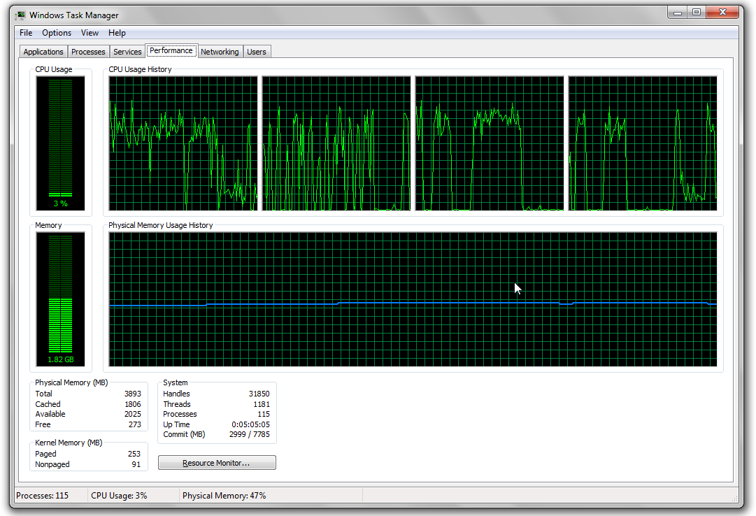 Then, I suspended both processes. The CPU usage immediately went down; here’s what it looked like after a few moments for the previous CPU usage on the graph to clear: