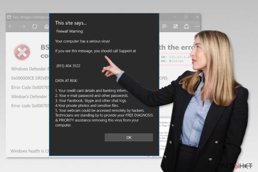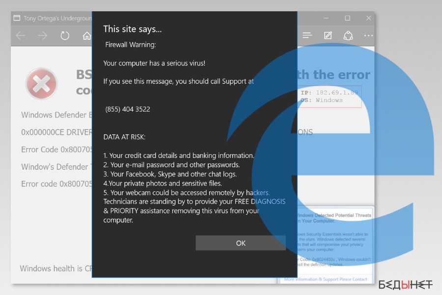 Microsoft Edge вирус — это термин, используемый для описания мошенничества технической поддержки, используемого для настройки пользователей браузера Windows 10. Эта кибер-угроза показывает фальшивую веб-страницу, которая сообщает об обнаруженном вирусе на компьютере. Пользователям настоятельно рекомендуется позвонить на номер (855) 404 3522. Тем не менее, это номер технической поддержки, который вы не должны набирать.