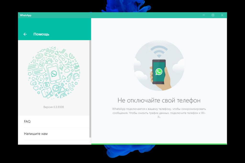 Запустив приложение, откроется основное окно программы, где в левой колонке отображаются все чаты. Справа, пока вы не откроете чат с каким-либо человеком, будет отображаться предупреждение, о том, чтобы вы не отключали свой телефон, на котором у вас также должен быть WhatsApp.
