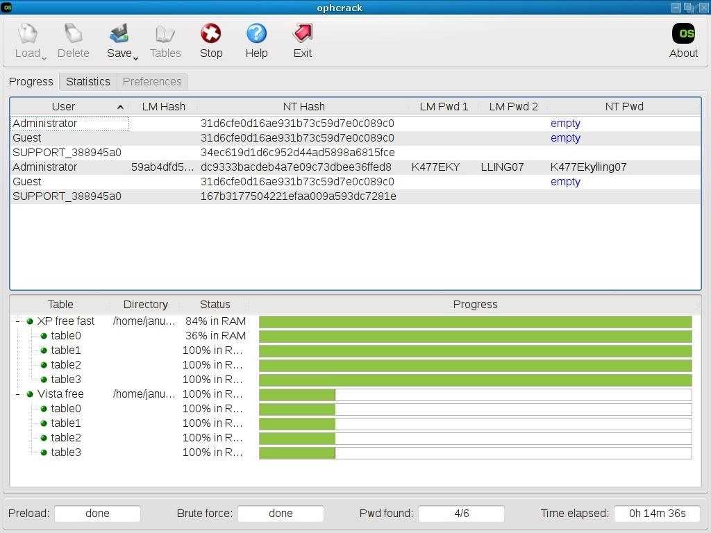 Он взламывает LM и NTLM (Windows) хеши. Для взлома Windows XP, Vista и Windows 7 вы можете скачать бесплатные радужные таблицы. Вы можете скачать Ophcrack на SourceForge —SourceForge, а еще вы можете получить бесплатные и premium радужные таблицы для Ophcrack —здесь.