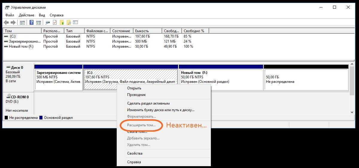 Пример такой задачи, которую не может решить встроенная в операционную систему утилита «Управление дисками», но с успехом решает упомянутая выше сторонняя программа, продемонстрирован ниже на изображении. Здесь у нас есть два тома жёсткого диска (C и F), а также уже освобождённое для присоединения к разделу C пространство в размере 50 гигабайт. Мы видим, что при попытке расширить том C на размер этого нераспределённого пространства, система нам это сделать не даёт — пункт «Расширить том…» остаётся неактивен (всё потому, что расположено необходимое нам пространство через другой том — между С и нераспрелелённым пространством находится ещё том F).