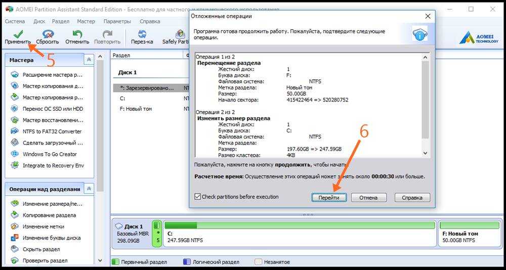 Нажмите «Ок», а затем — «Применить» в главном окне программы. В случае, если один из разделов — системный, потребуется перезагрузка компьютера, которая продлится дольше чем обычно (если это ноутбук, убедитесь, что он включен в розетку).