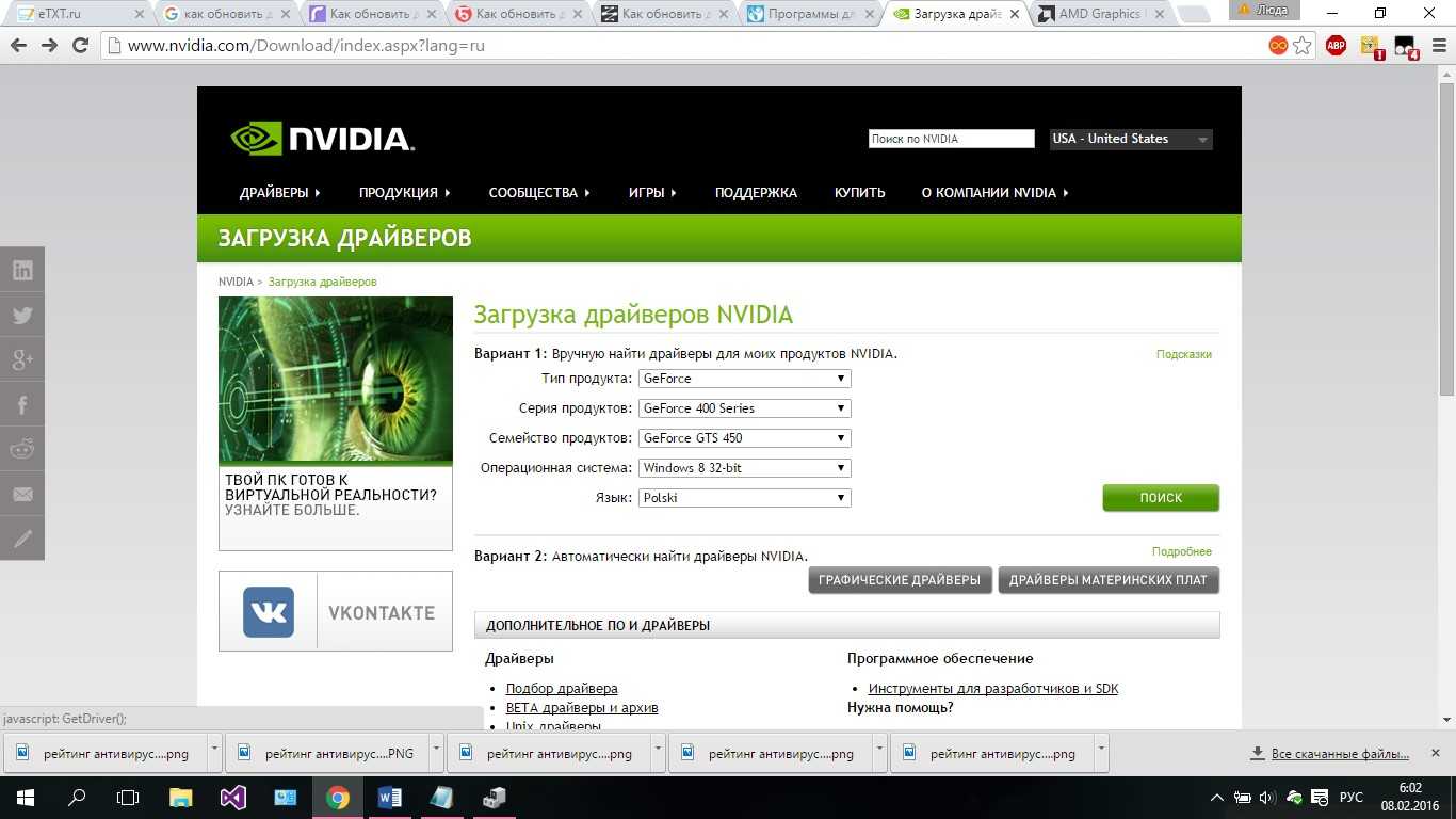 процесс выбора драйвера NVIDIA geforce на официальном сайте компании