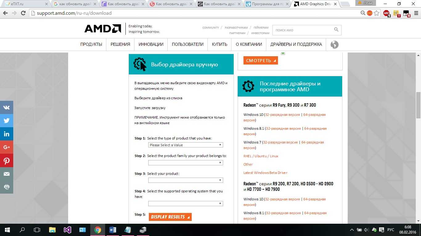 процесс выбора драйвера amd Radeon на официальном сайте компании