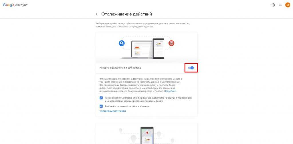 Зайдите на страницу вашего аккаунта в Google и нажмите кнопку «Управление историей».