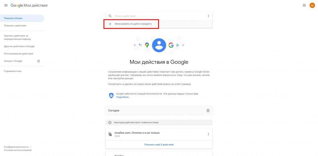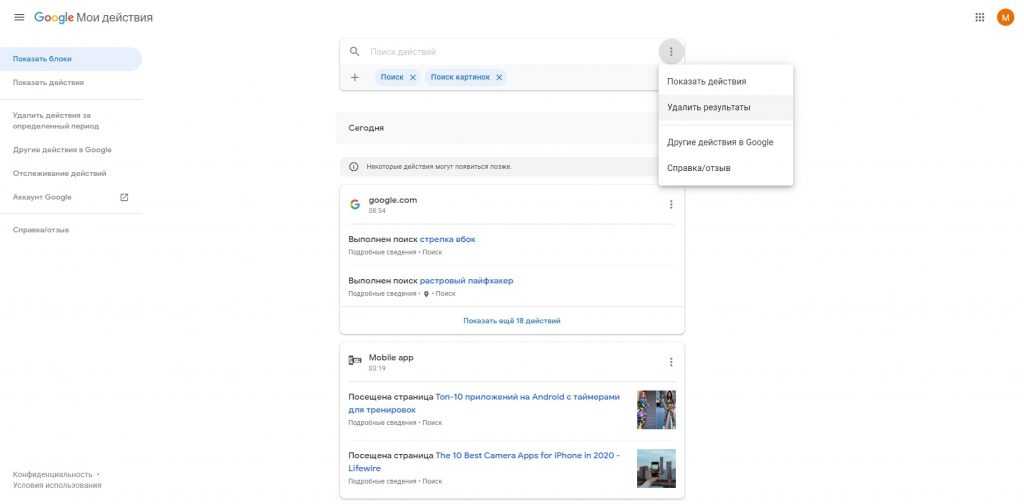 Все ваши действия под единым аккаунтом рассортированы по дням и по устройствам. Удалять можно как единичные события, так и все поисковые запросы за определенную дату. Для этого требуется нажать по вертикальному троеточию и кликнуть по меню «Удалить»: