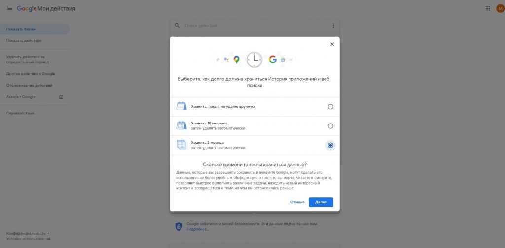 Отметьте подходящий вариант: «Хранить 18 месяцев» или «Хранить 3 месяца». Все запросы старше этого срока Google будет удалять автоматически. Нажмите «Далее» и подтвердите удаление.
