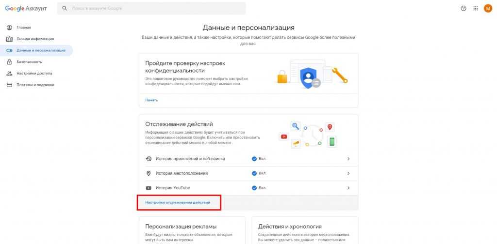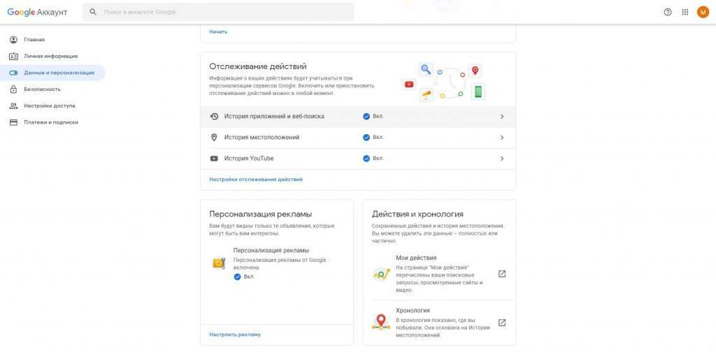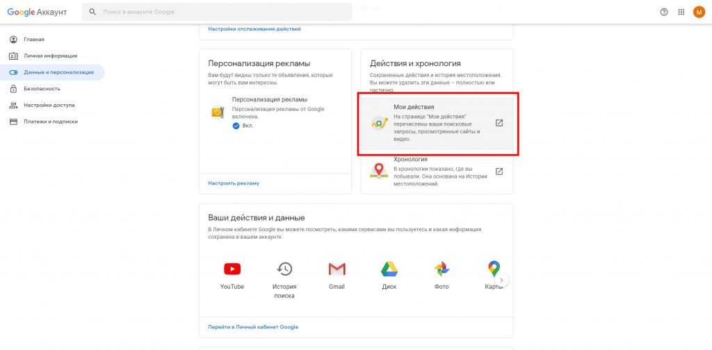 Затем кликните «Данные и персонализация». Это пункт управления вашей информацией, которую Google заносит в историю поиска. Здесь вы можете удалить свои запросы вручную, настроить их автоочистку или вовсе запретить поисковику их сохранять.