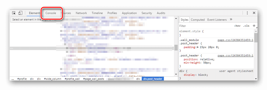 - Теперь, когда вы находитесь у самого истока стены, видите первую публикацию, нужно открыть консоль браузера. Как это сделать – зависит от того, какой браузер используется. Традиционно в Chrome открывается консоль через тройную комбинацию кнопок – Ctrl+Shift+J.