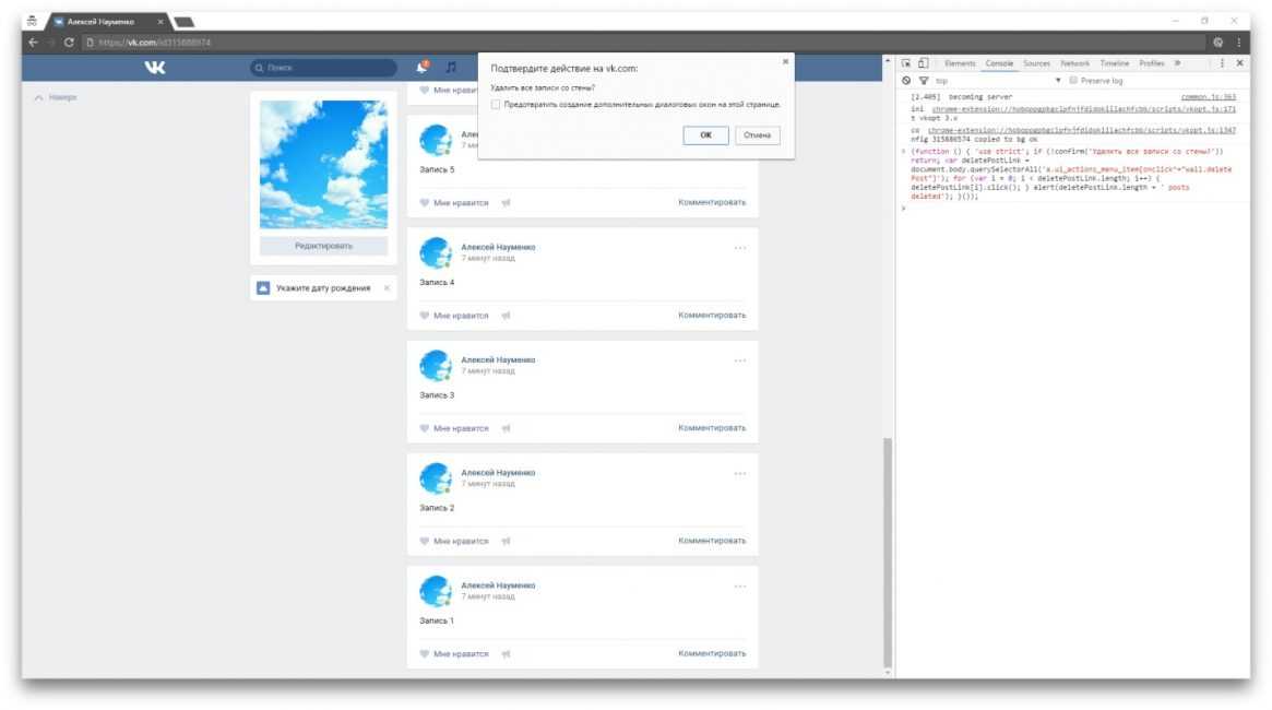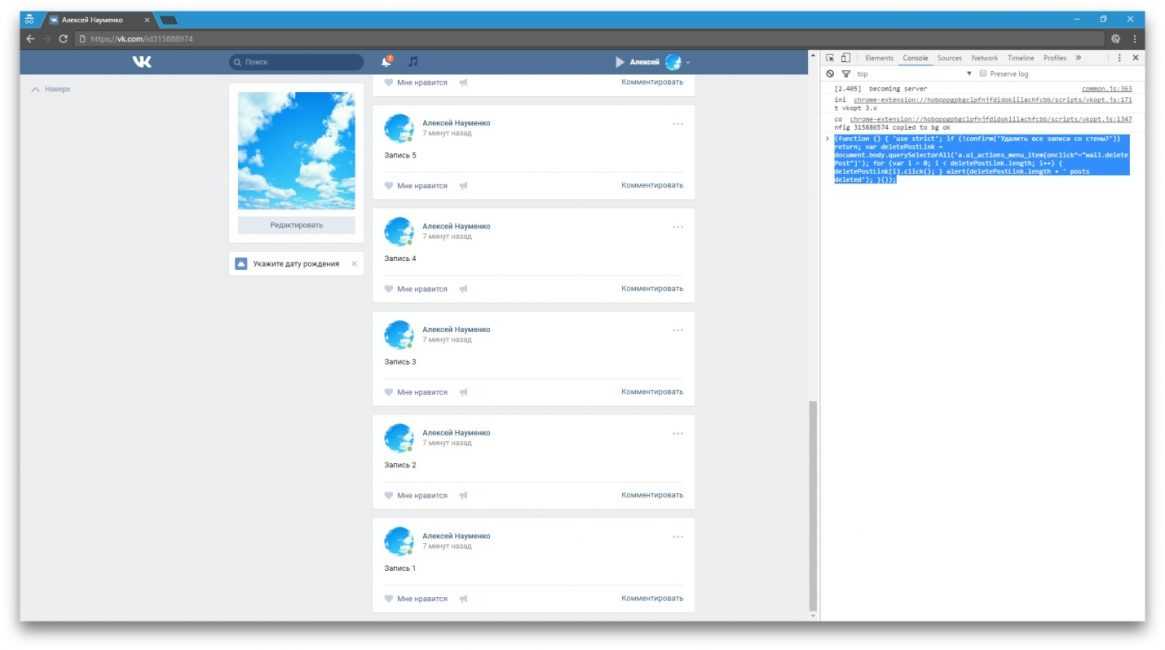 Важно! Данный скрипт позволит полностью очистить стену в вк в яндексе, хроме и опере без возможности восстановления данных. Делайте этот шаг лишь в том случае, если уверены в своих действиях.. Удаление осуществляется без вашего какого-либо вмешательства с шагом в 1 секунду