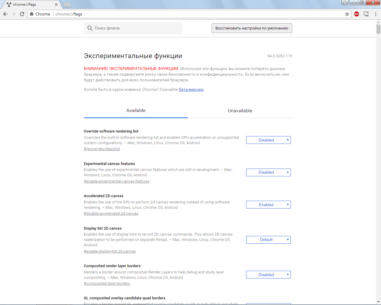 - В строке браузера введите следующее: chrome://flags/#enable-experimental-canvas-features.