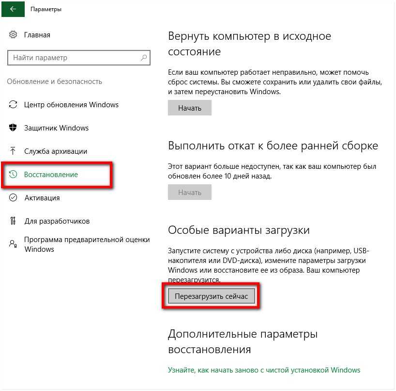 - Обновление и безопасность — Восстановление — Перезагрузить сейчас