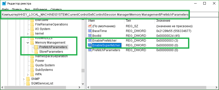 Кстати, обратите внимание, что ветка все еще называется PrefetchParameters – Microsoft не позаботилась переименовать этот раздел реестра еще со времен Windows XP.