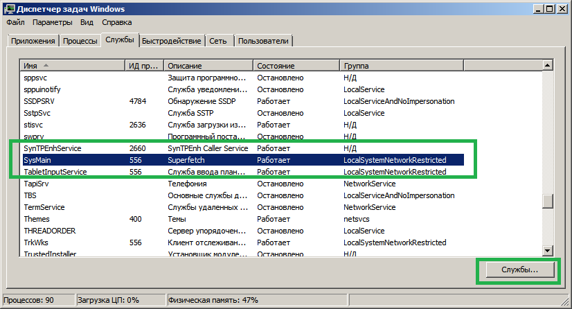 Указанная последовательность действий позволяет отключить службу Superfetch до следующей перезагрузки компьютера. Чтобы отключить службу полностью, нажмите на кнопку Службы, для запуска системной программы «Службы».