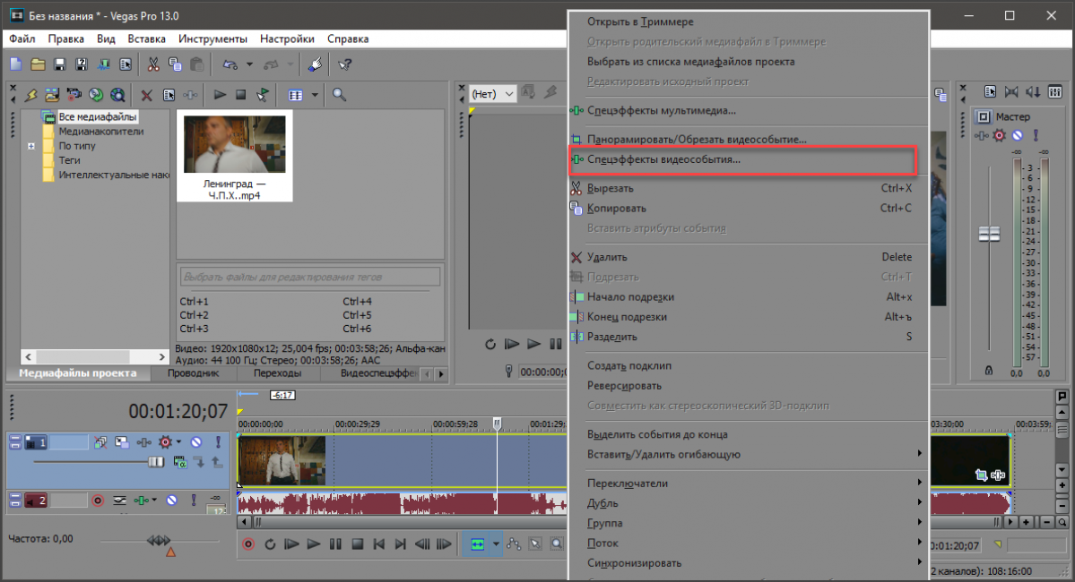 Теперь щелкаем по объекту в шкале времени правой кнопкой мыши и в появившемся меню щелкаем пункт «Спецэффекты видеособытия».