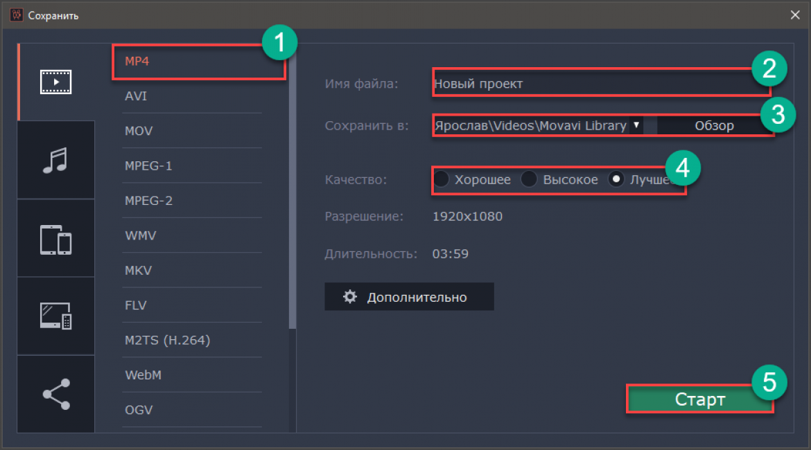 В появившемся окне выбираем формат файла, его имя, путь сохранения и качество видеоряда. Затем нажимаем на кнопку «Старт».