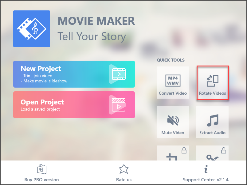 Сразу же откроется главное окно приложения. Дальше есть несколько вариантов. Можно создать новый проект и заняться полноценным монтажом, а не только разворотом видео. А можно выбрать из «быстрых инструментов» вариант с поворотом изображения. Выбираем последнее. Жмем на кнопку «Rotate Videos» в блоке «Quick Tools».