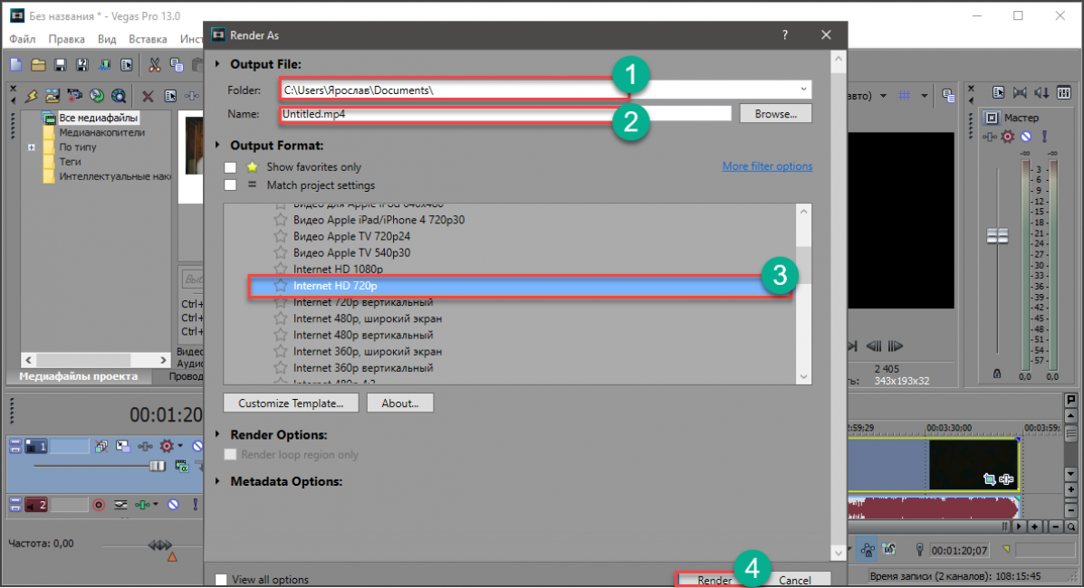Выбираем путь сохранения, имя файла и тип формата (вместе с качеством видеоряда). После этого нажимаем на кнопку «Render».