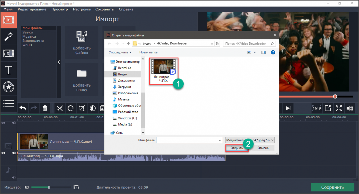 В следующем окне предлагается выбрать ролик. Ищем нужный клип, выбираем его и жмем на кнопку «Открыть».