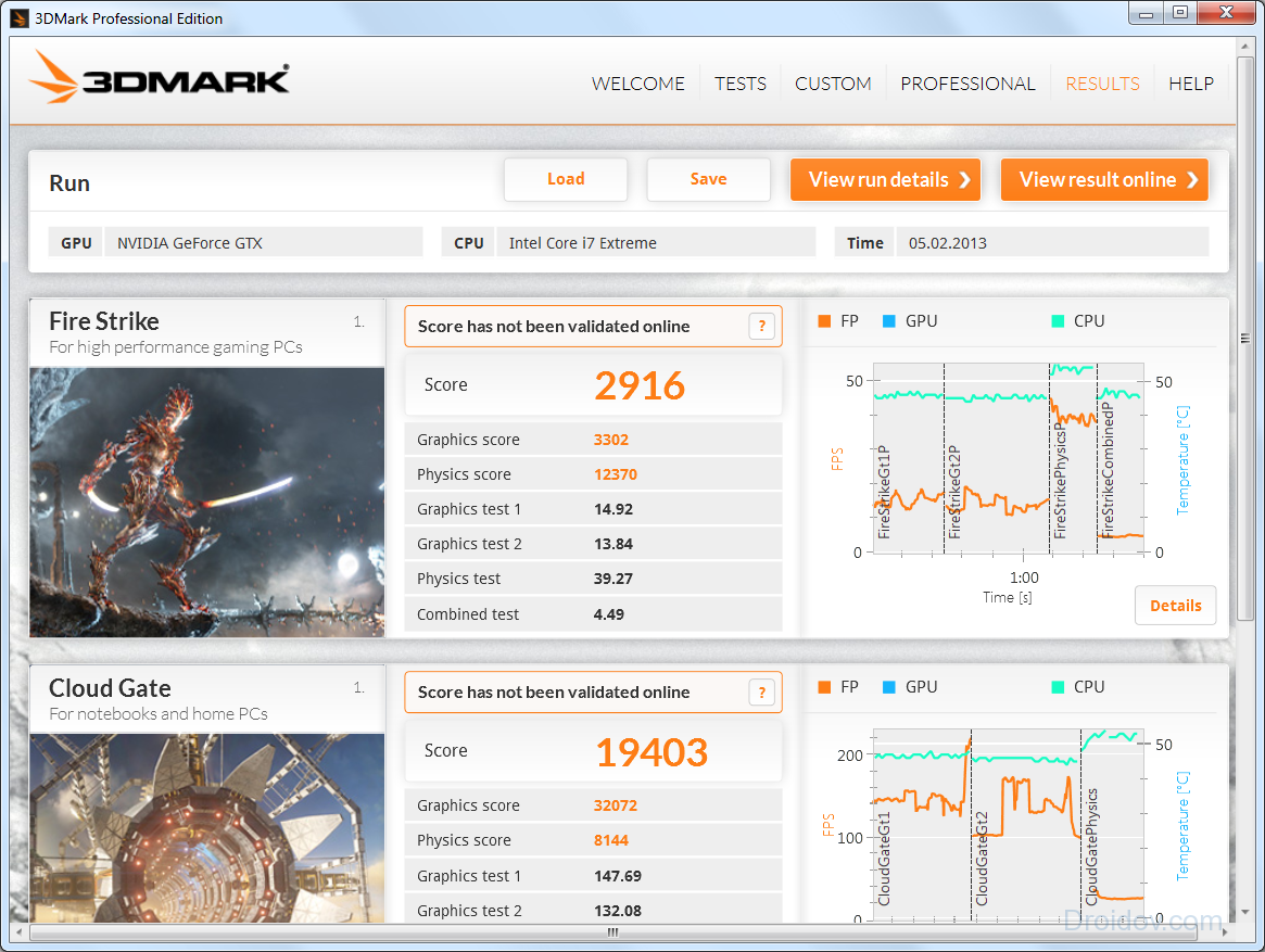 Как протестировать видеокарту в 3D Mark: запустите программу и наблюдайте за ходом тестов. Приложение оценит поведение графического адаптера и процессора под разными типами нагрузок. Через 10-15 мин тестирование окончится, его результаты будут отображены в браузере. Их сразу можно сравнить с данными других пользователей.