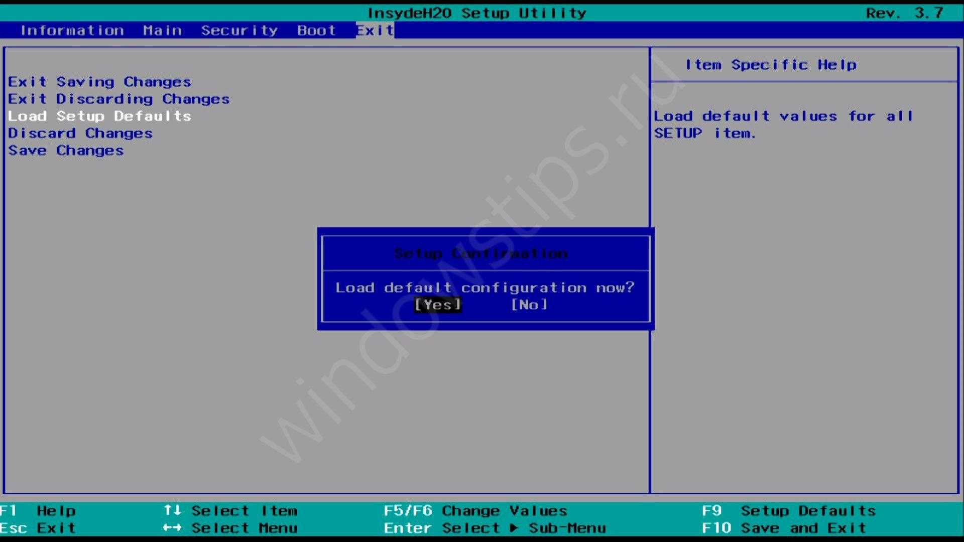 Появится небольшое окно с вопросом Load setup defaults. Для подтверждения выделите Yes и нажмите на клавиатуре клавишу Enter. Заводские настройки восстановлены. Нажмите F10 для сохранения настроек и выхода из БИОС.
