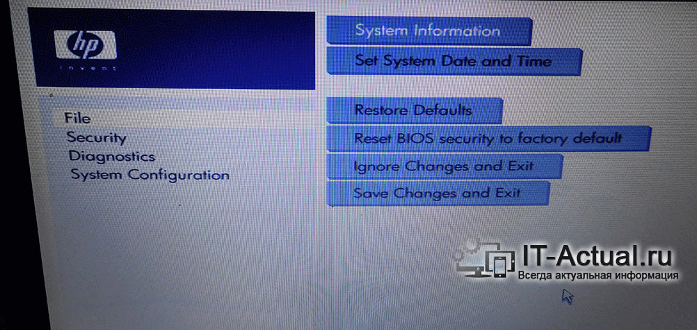 К примеру, в ноутбуке HP BIOS выглядит следующим образом. Здесь сброс настроек осуществляется выбором пункта Restore Defaults.