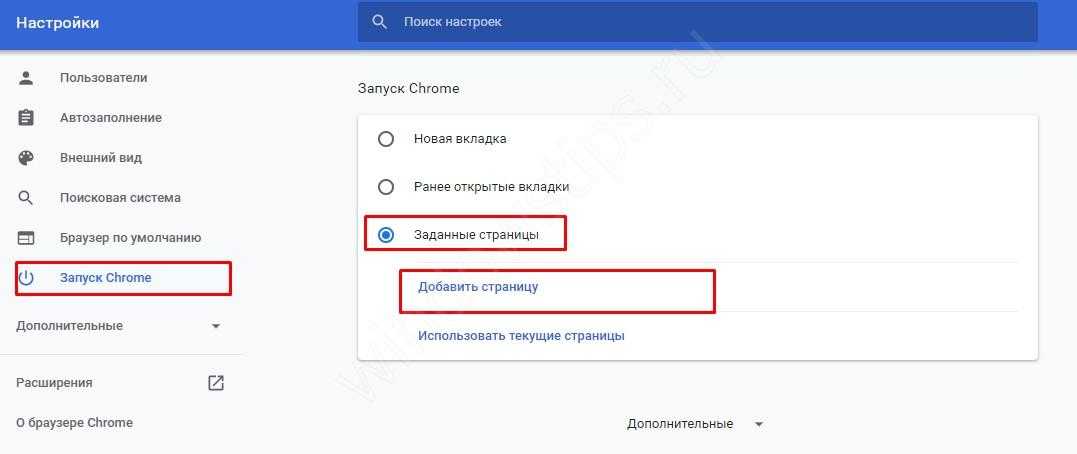 Чтобы страница Яндекс открывалась и при пуске Гугл Хром, войдите в раздел Запуск Chrome, а там перейдите в раздел Заданные страницы и жмите на кнопку добавления. Пропишите необходимый сайт.