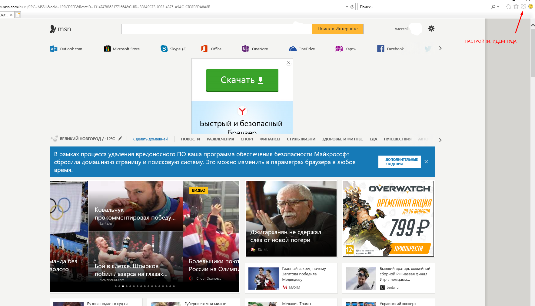 Как ни странно, в Internet Explorer тоже иногда нужно делать такие настройки. Этот браузер по прежнему является частью операционной системы Windows и иногда при вирусном заражении вместо стартовой страницы всплывает реклама. Браузеры на Chrom программно связаны с настройками IE, и смена стартовой страницы там иногда помогает быстро восстановить стартовую страницу в других ваших браузерах. Открываем IE. Там по умолчанию стоит в настройках заморская поисковая система MSN, как говориться, сам Бог велел… Идем в «Настройки»: