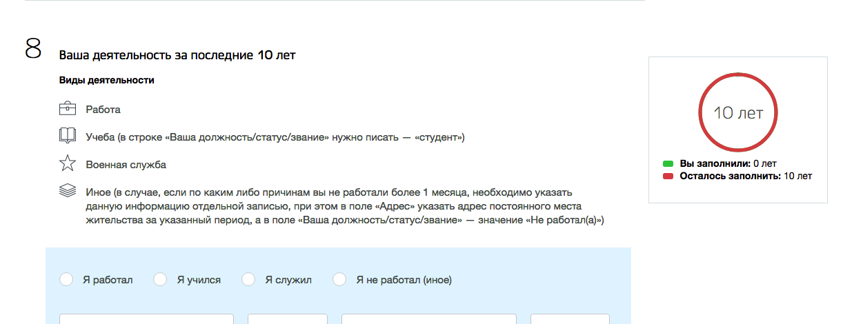 Восьмой шаг – заполнение сведений о деятельности (работе, учёбе и др.) за 10 лет. Данные сведения заполняют подробно, по годам. На странице постепенно меняется индикатор с подсказками и степени заполнения сведений.