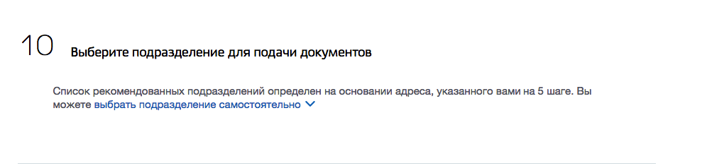 Последняя стадия заполнения заявки – выбор подразделения для получения загранпаспорта. По умолчанию в сервисе «Госуслуги» устанавливается адрес в соответствии с выбранным вариантом в пункте 5. Нажав на строку «Выбрать подразделение самостоятельно», можно определить предпочтительное подразделение ГУВМ МВД и записаться на получение загранпаспорта через «Госуслуги» именно туда.